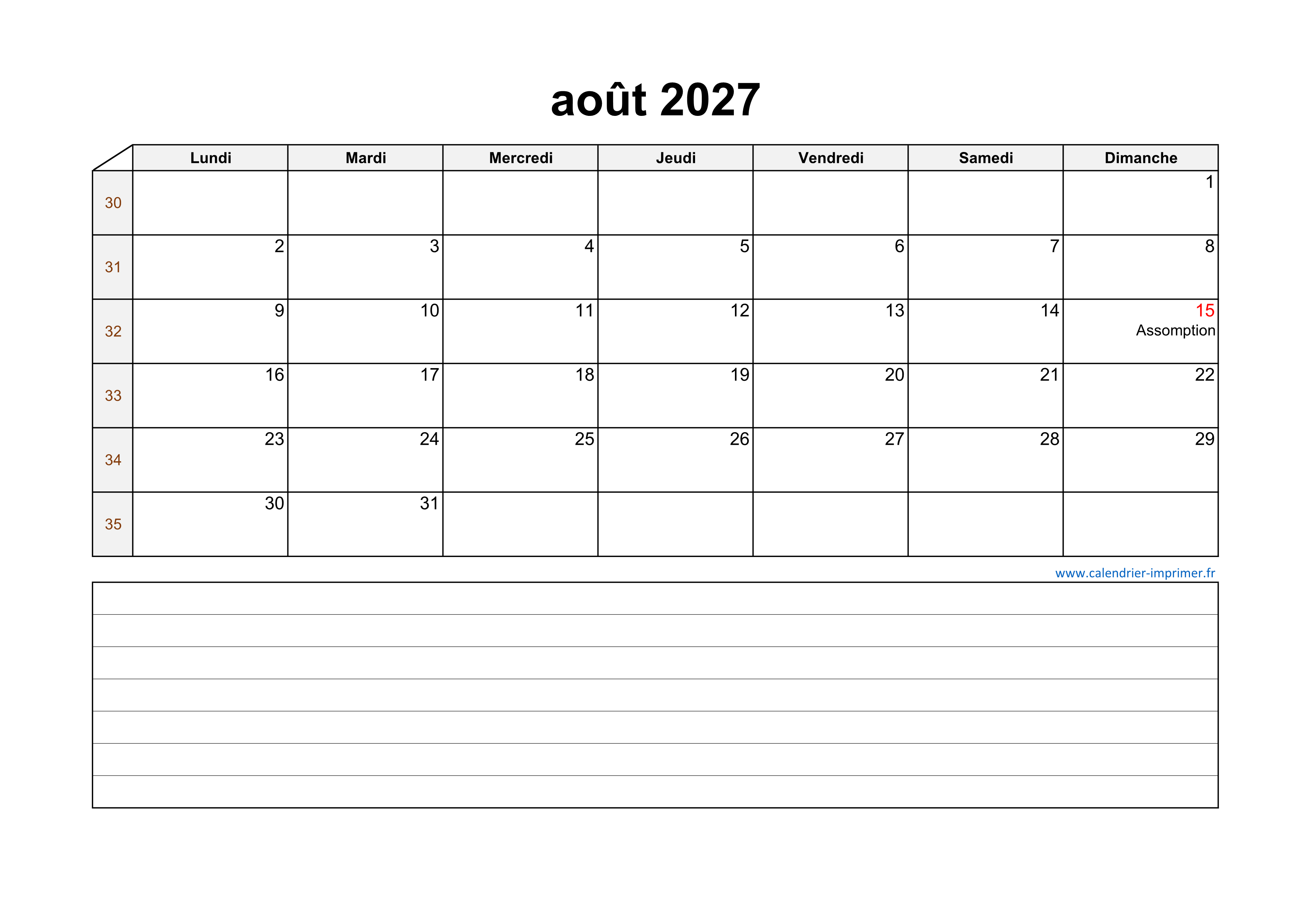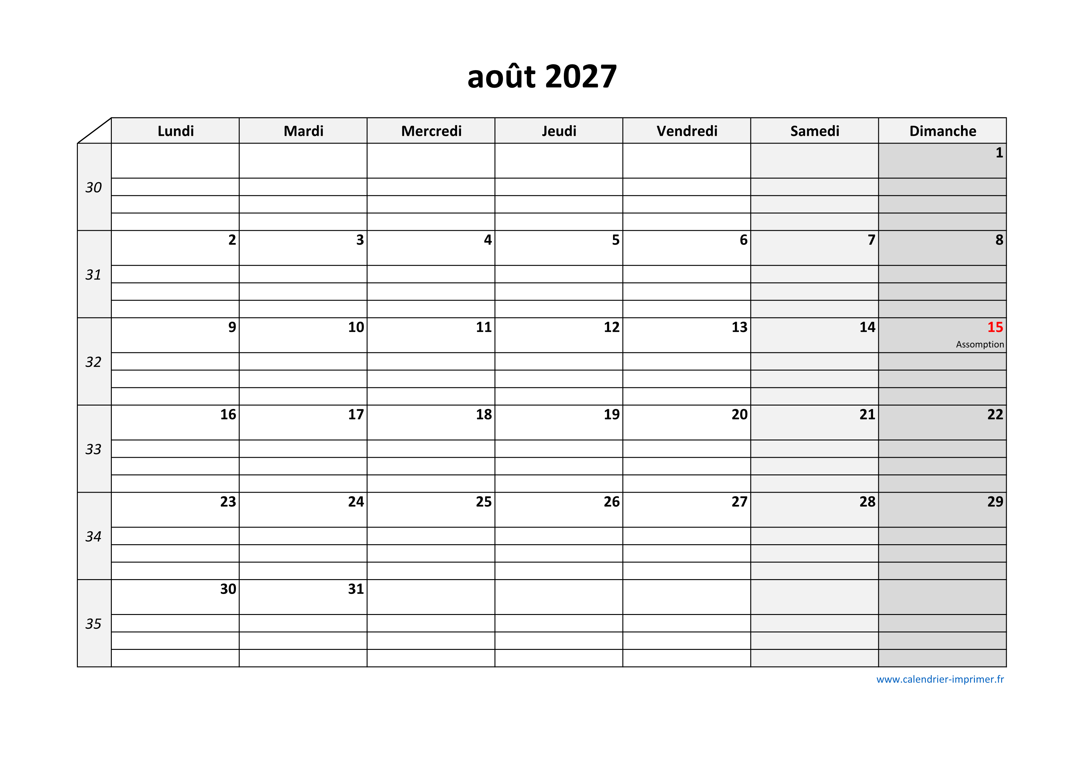 Calendrier août 2027 à imprimer gratuit. Modèle de calendrier de août gratuit pour 2027 que vous pouvez télécharger, personnaliser et imprimer. Calendrier Août 2027 avec les jours fériés, numéros de semaine, espace pour des notes ou des événements, conçu sur une page. Tous les modèles de calendrier de août 2027 sont disponibles aux formats Excel, Word, PDF et JPEG, formats de papier A4, horizontal/vierge. Sélectionnez le format que vous aimez, cliquez sur le lien Excel / Word / PDF / JPEG pour télécharger directement.