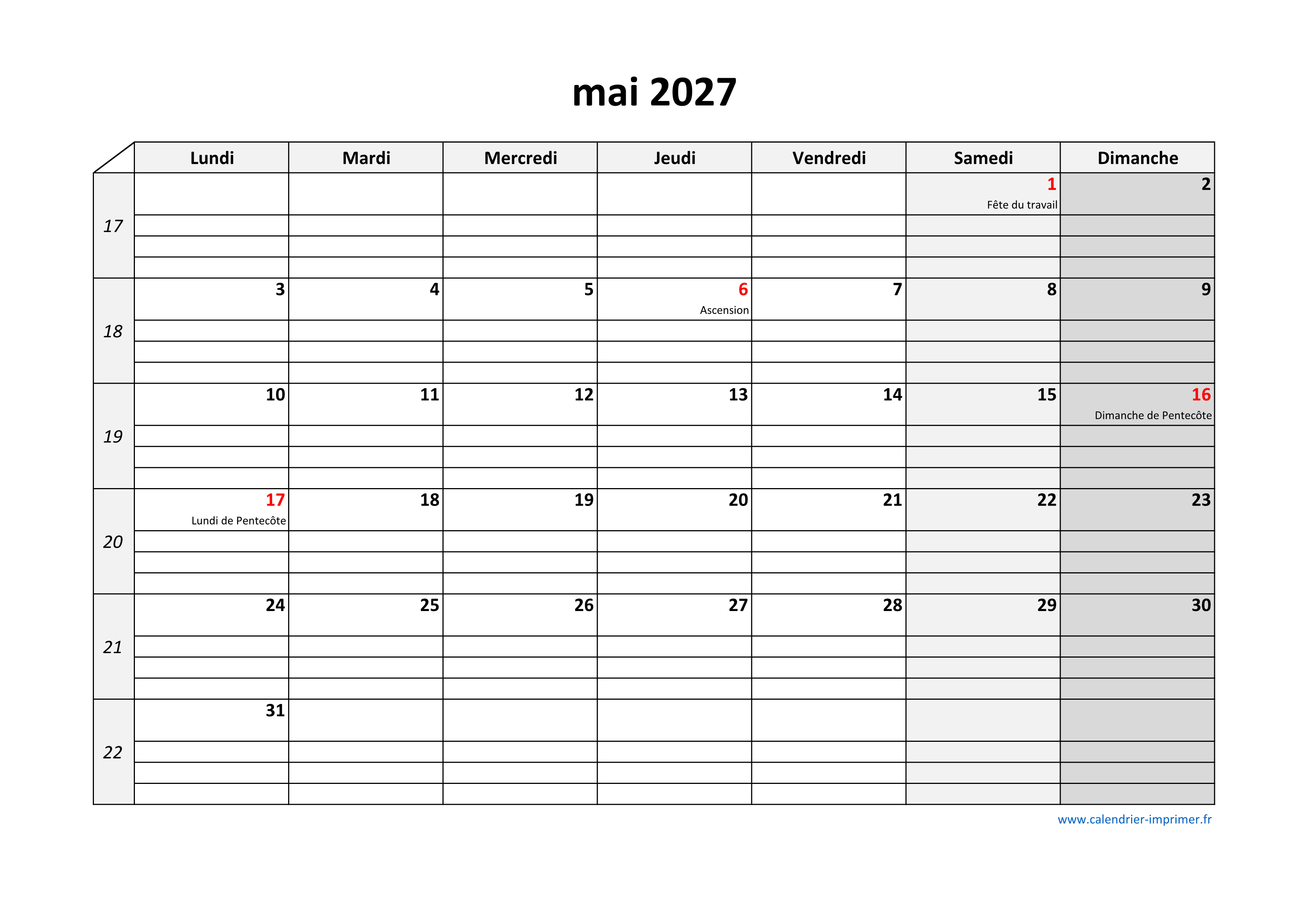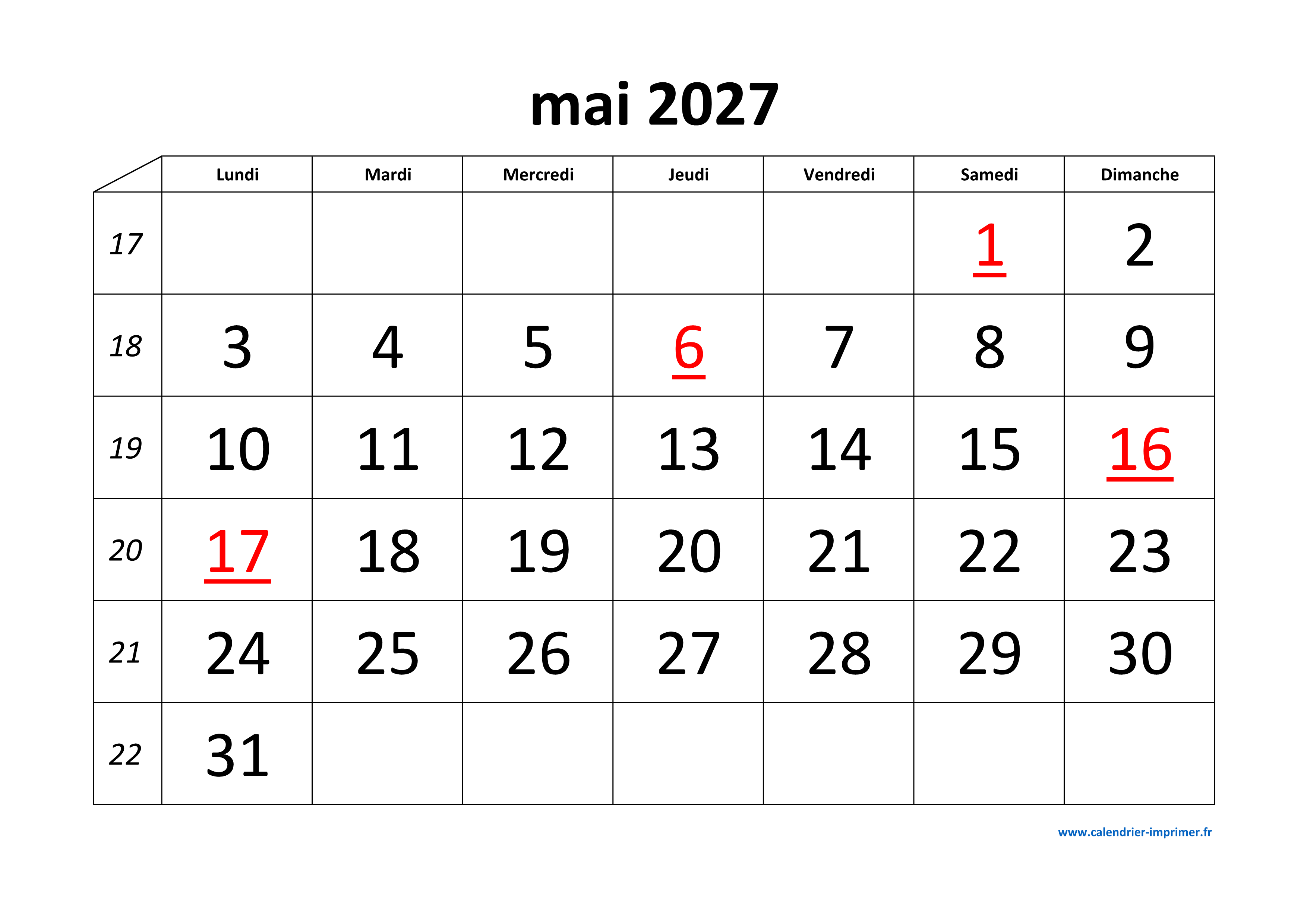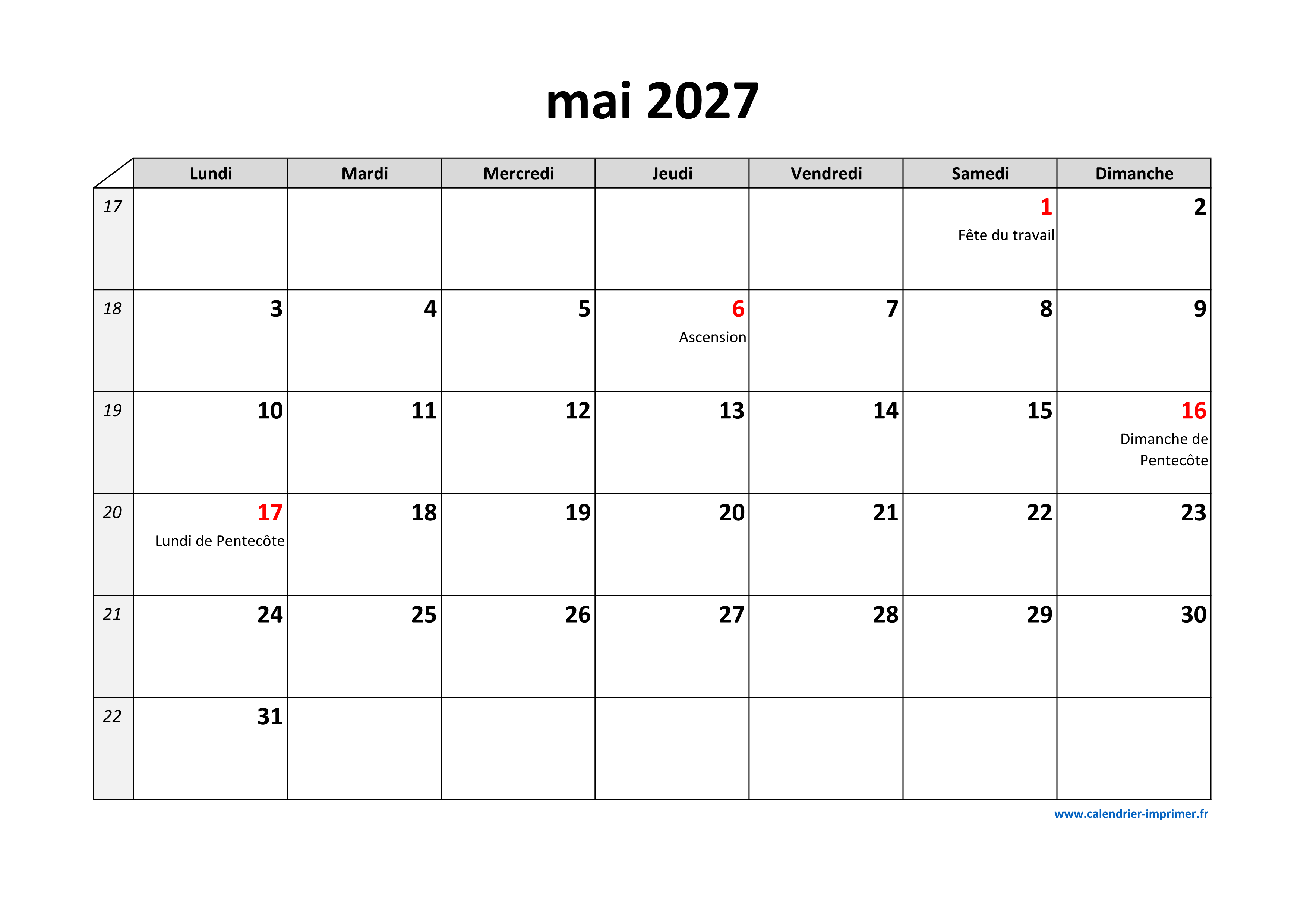 Calendrier Mai 2027 à imprimer