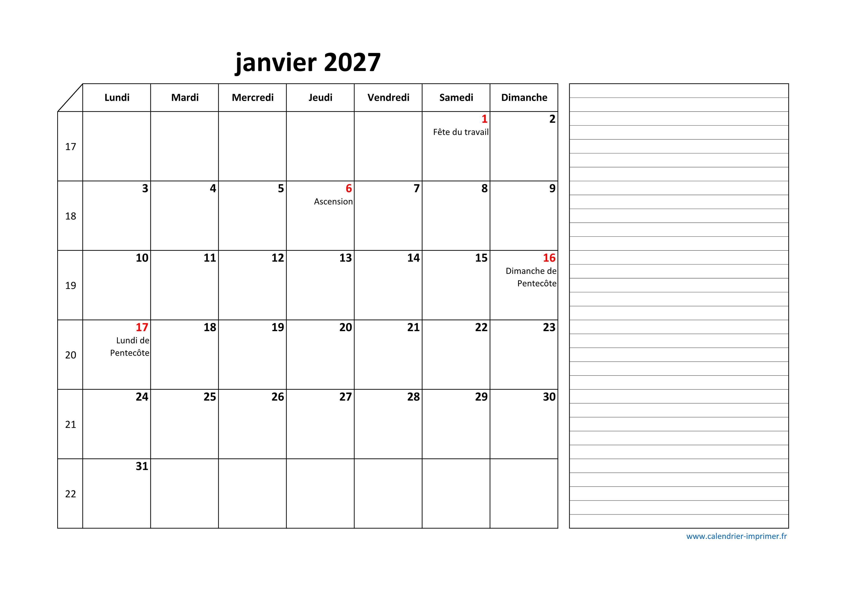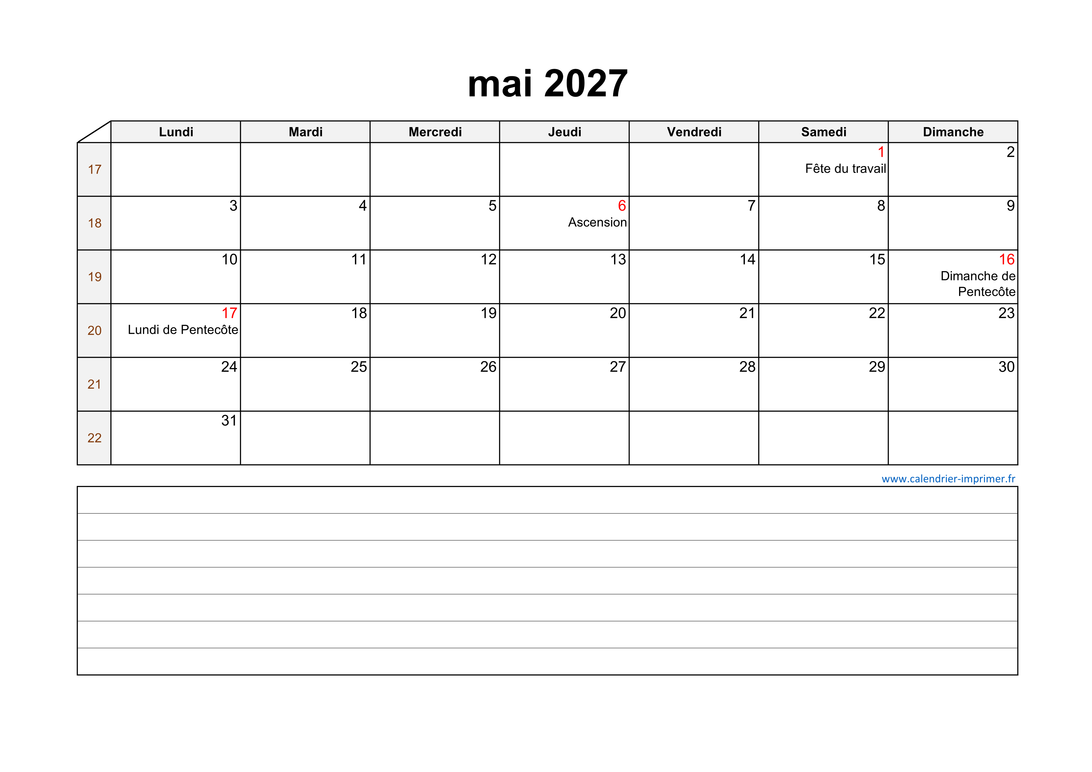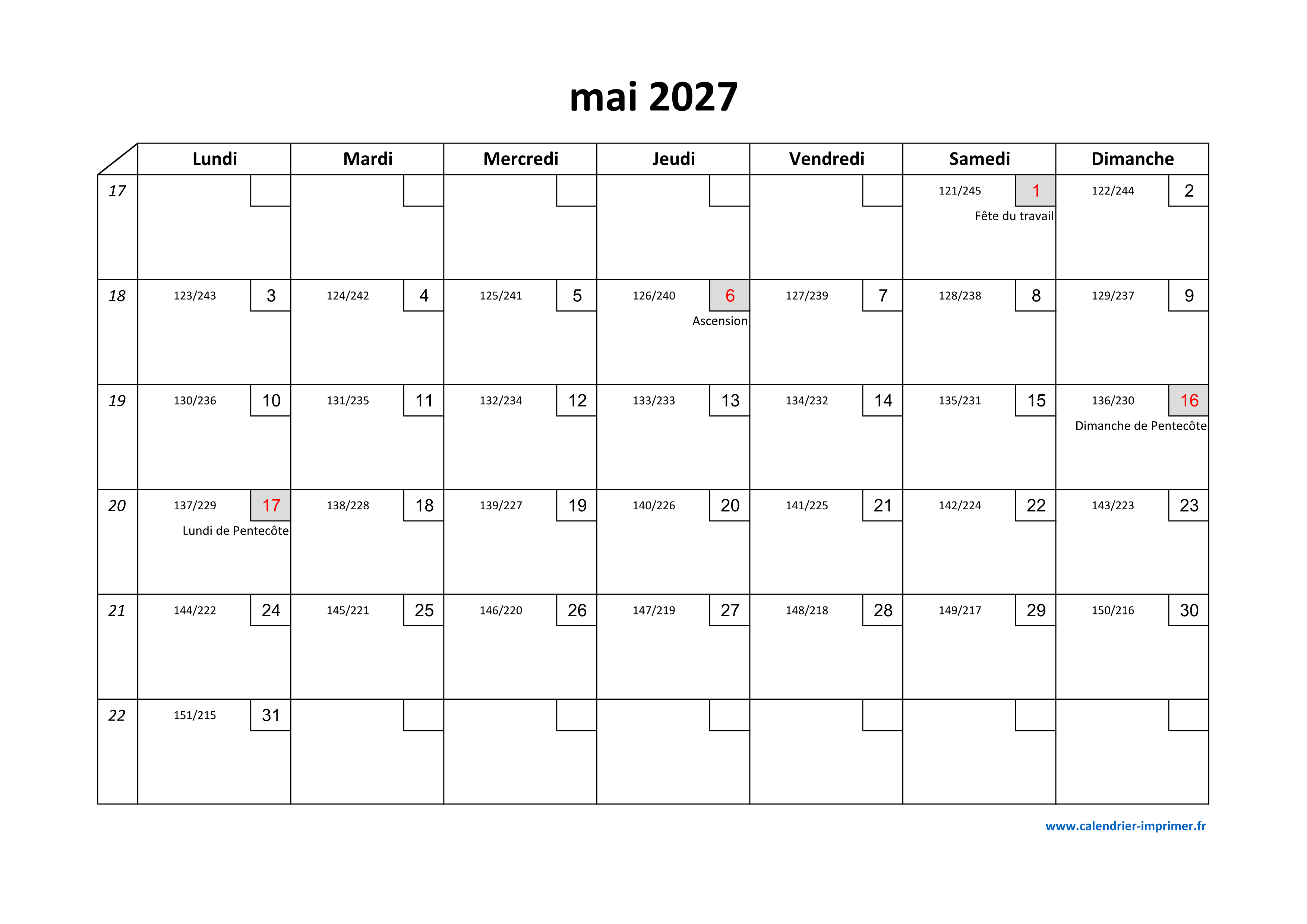 Calendrier Mai 2027 à imprimer