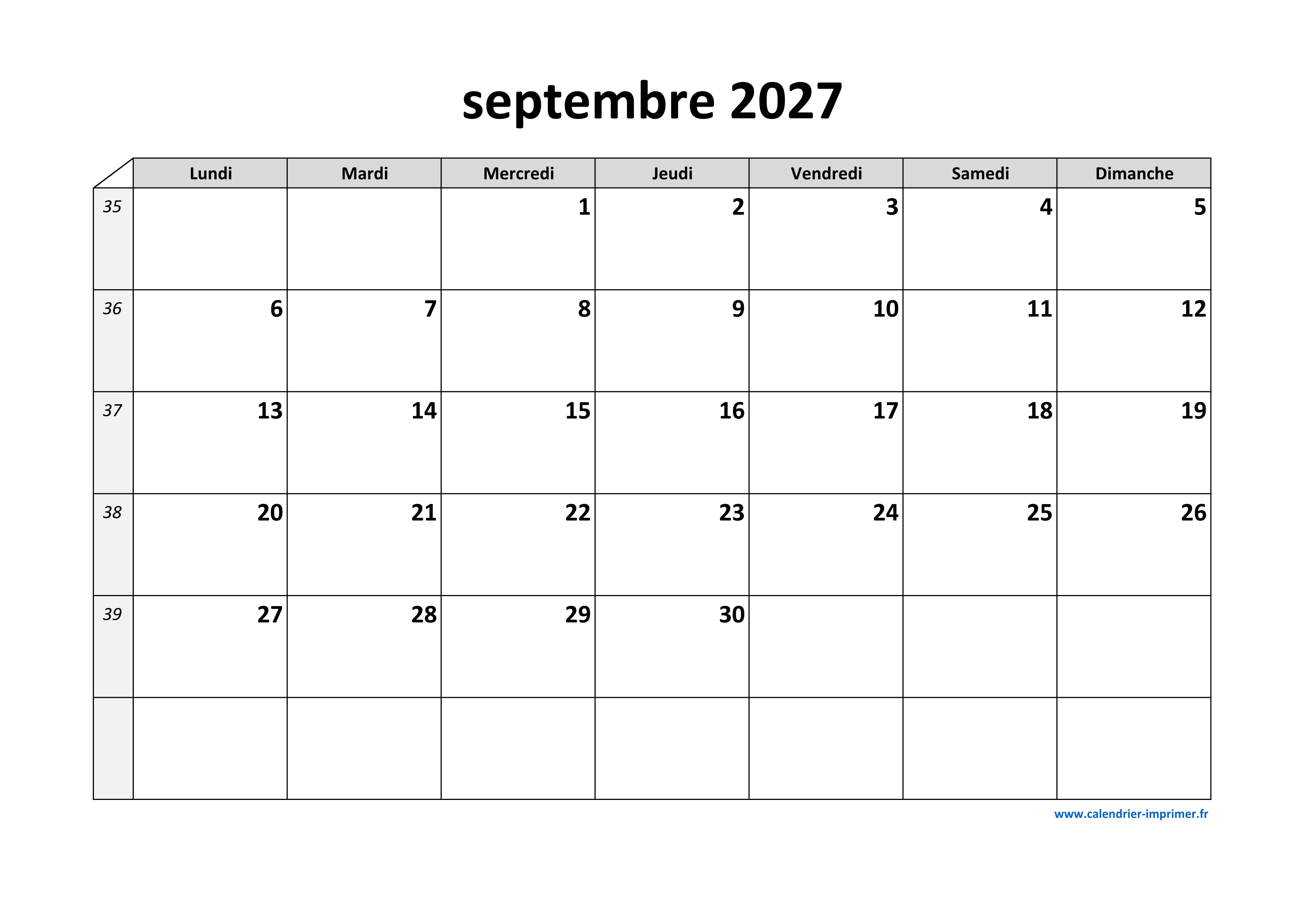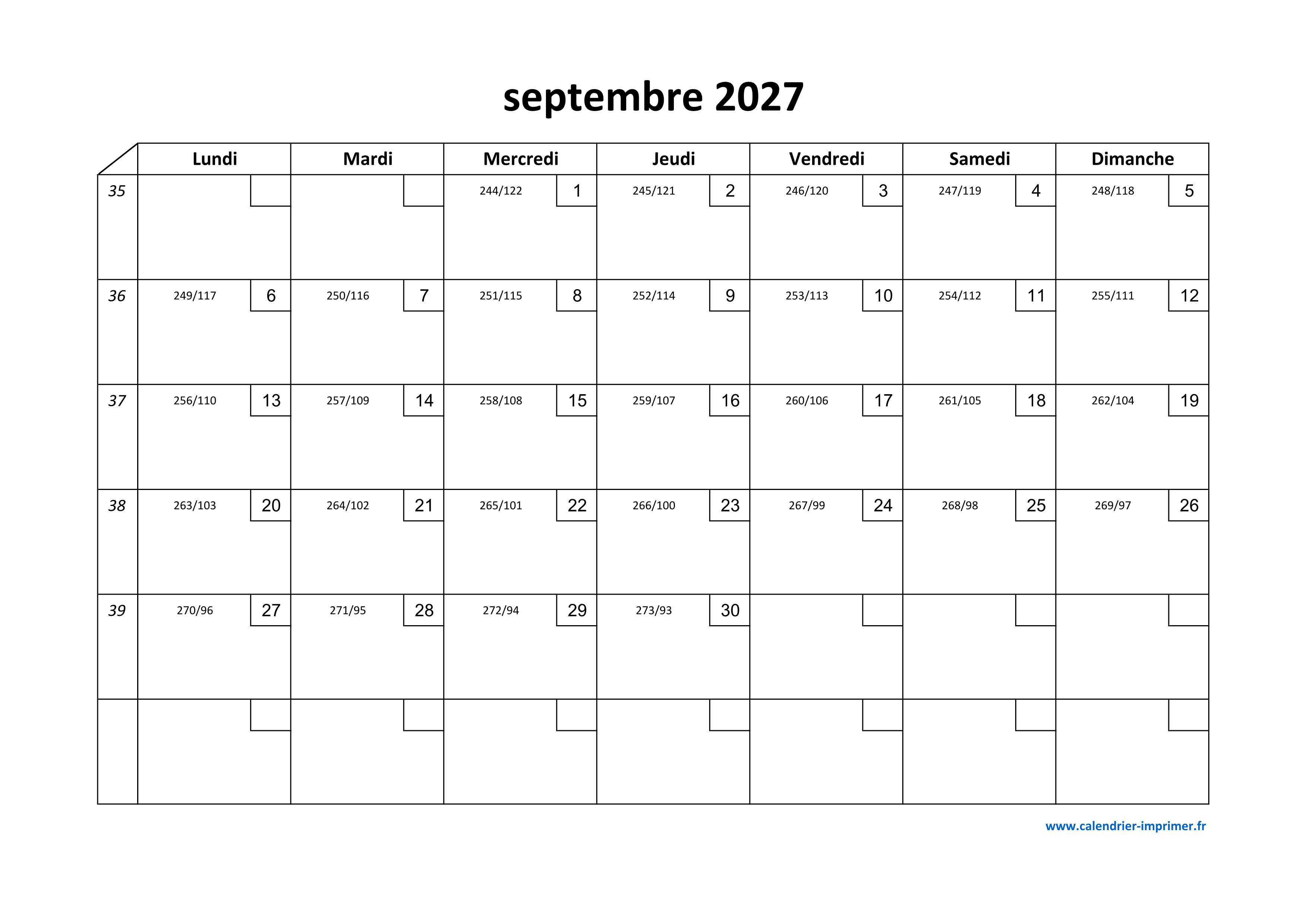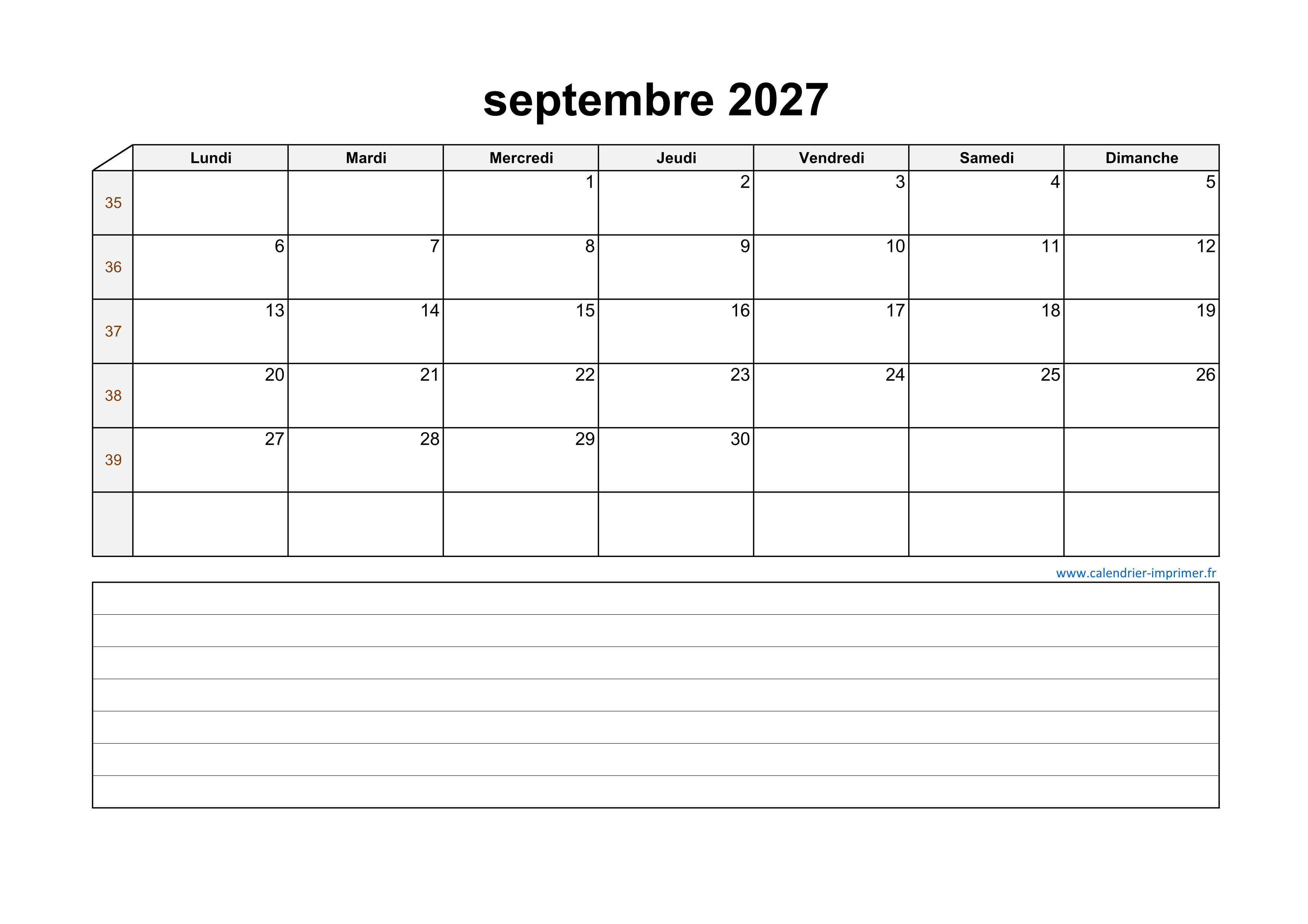 Calendrier septembre 2027 à imprimer gratuit. Modèle de calendrier de septembre gratuit pour 2027 que vous pouvez télécharger, personnaliser et imprimer. Calendrier Septembre 2027 avec les jours fériés, numéros de semaine, espace pour des notes ou des événements, conçu sur une page. Tous les modèles de calendrier de septembre 2027 sont disponibles aux formats Excel, Word, PDF et JPEG, formats de papier A4, horizontal/vierge. Sélectionnez le format que vous aimez, cliquez sur le lien Excel / Word / PDF / JPEG pour télécharger directement.