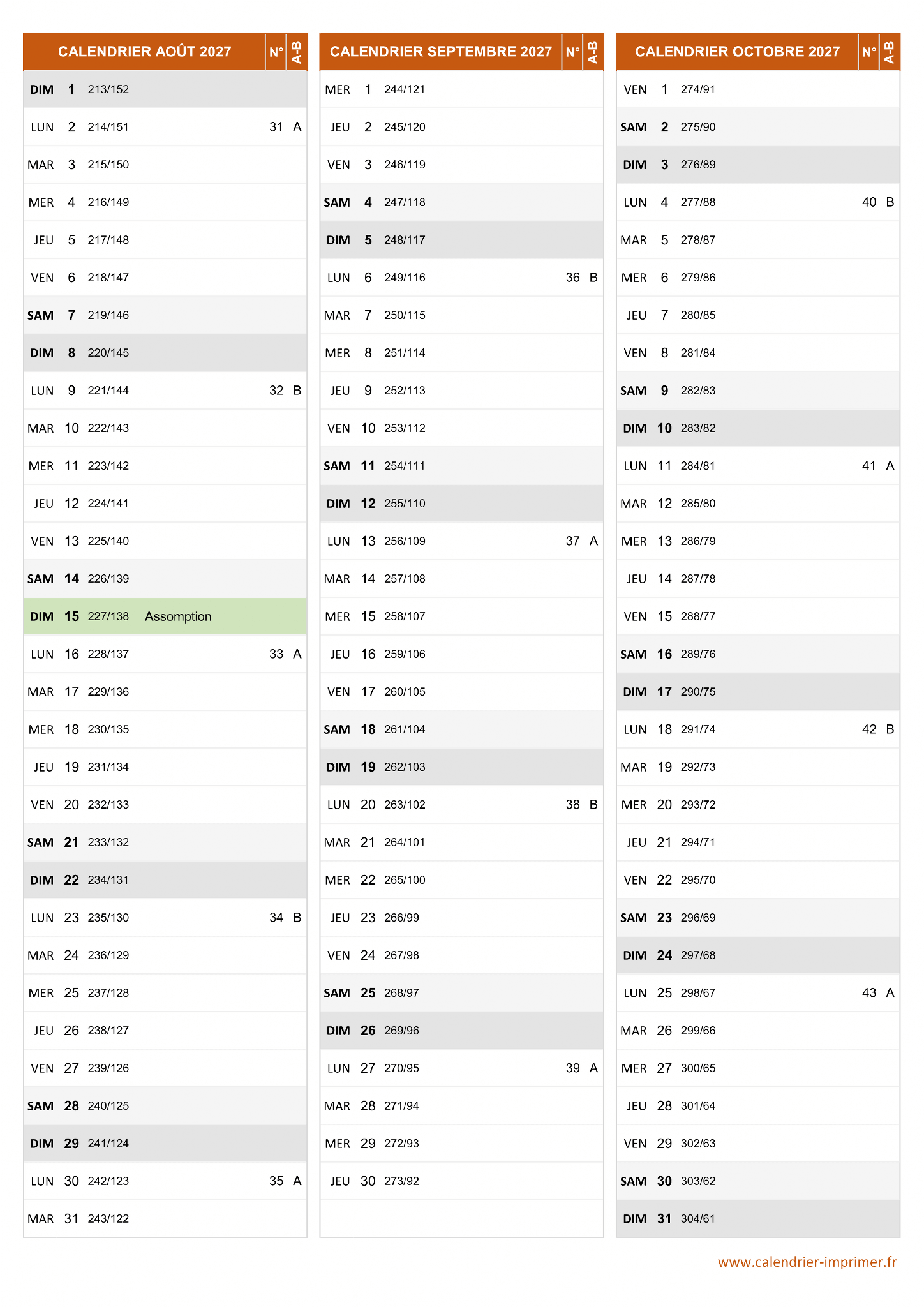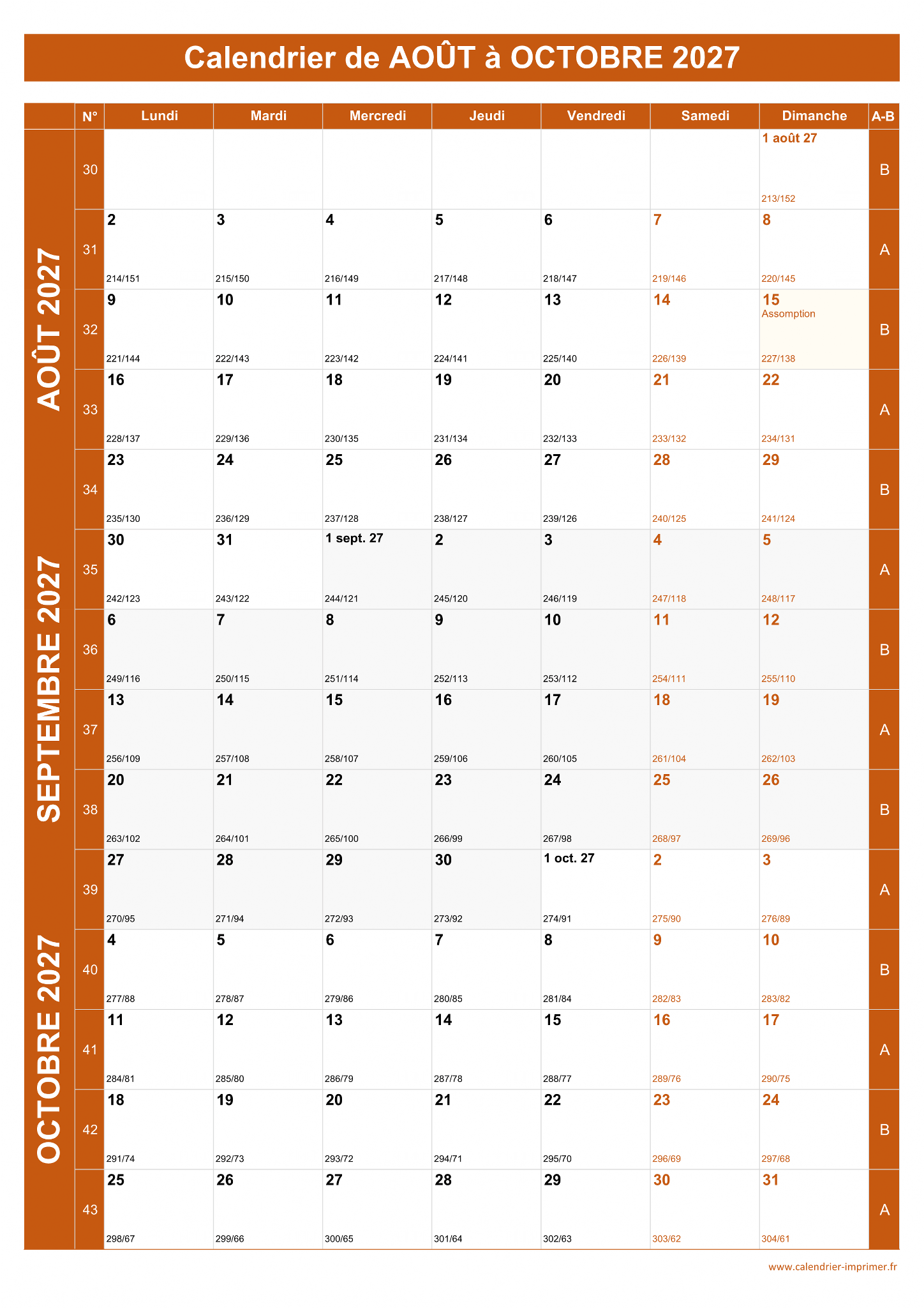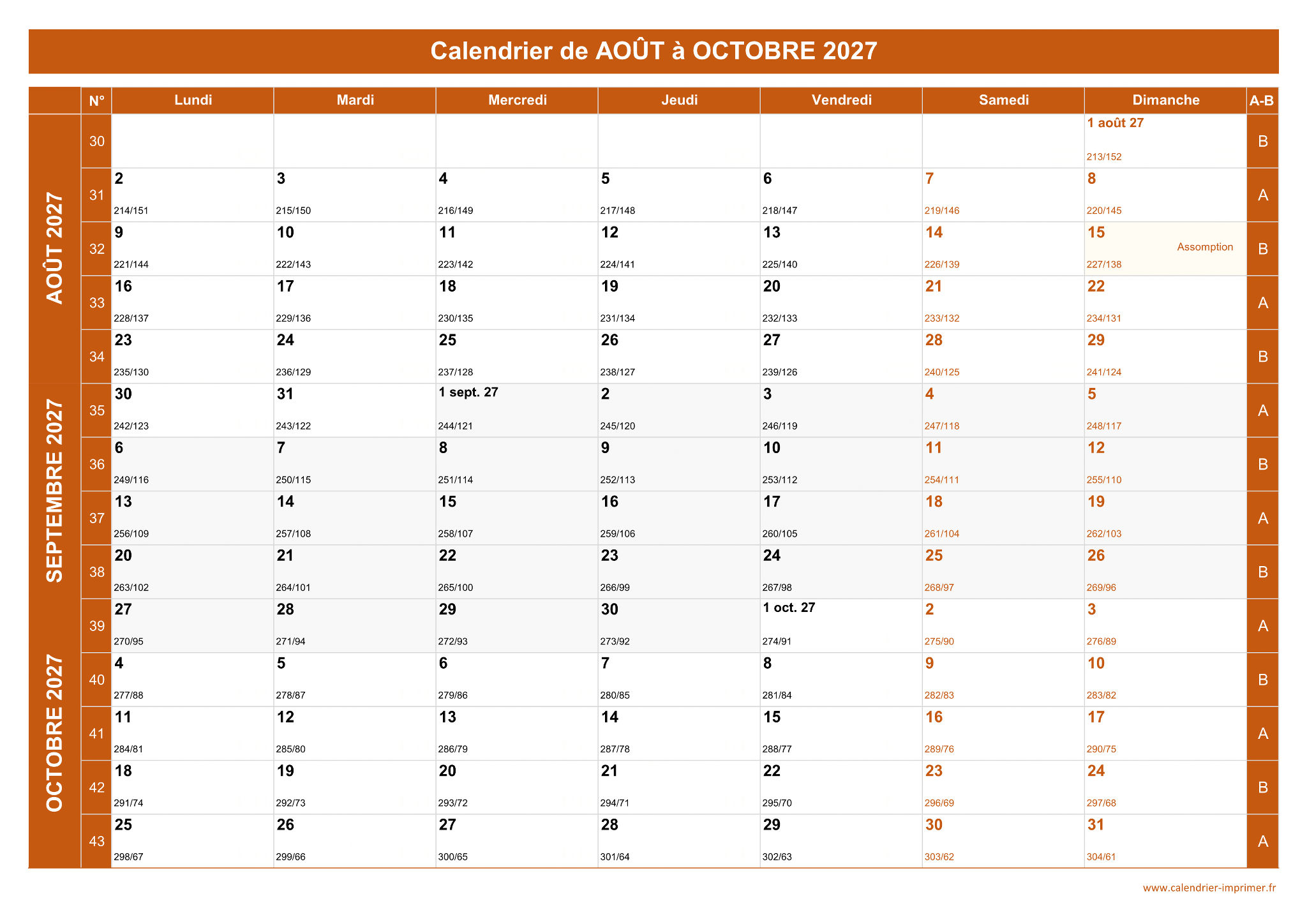 Calendrier Août à Octobre 2027