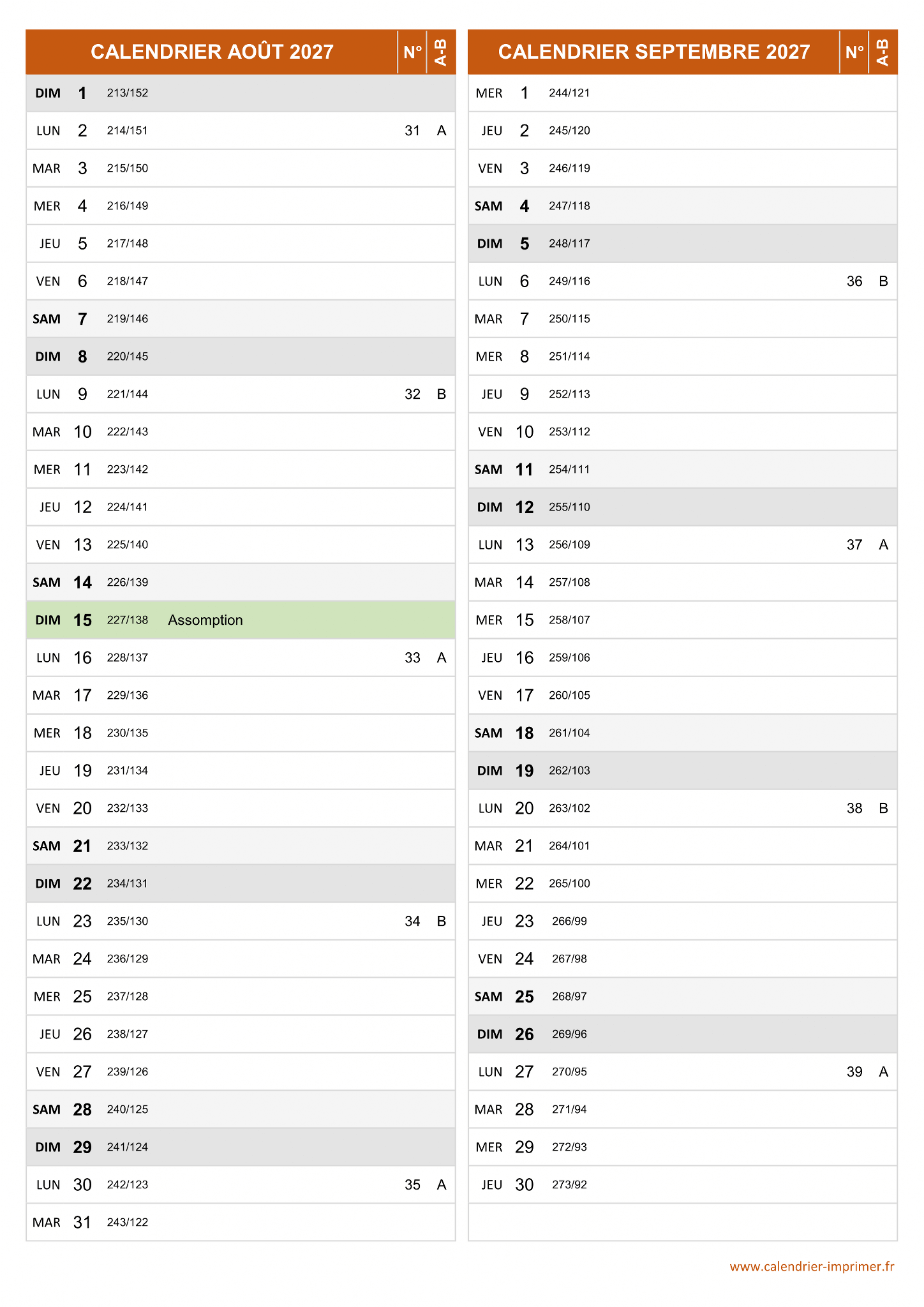 Calendrier Août et Septembre 2027 à imprimer
