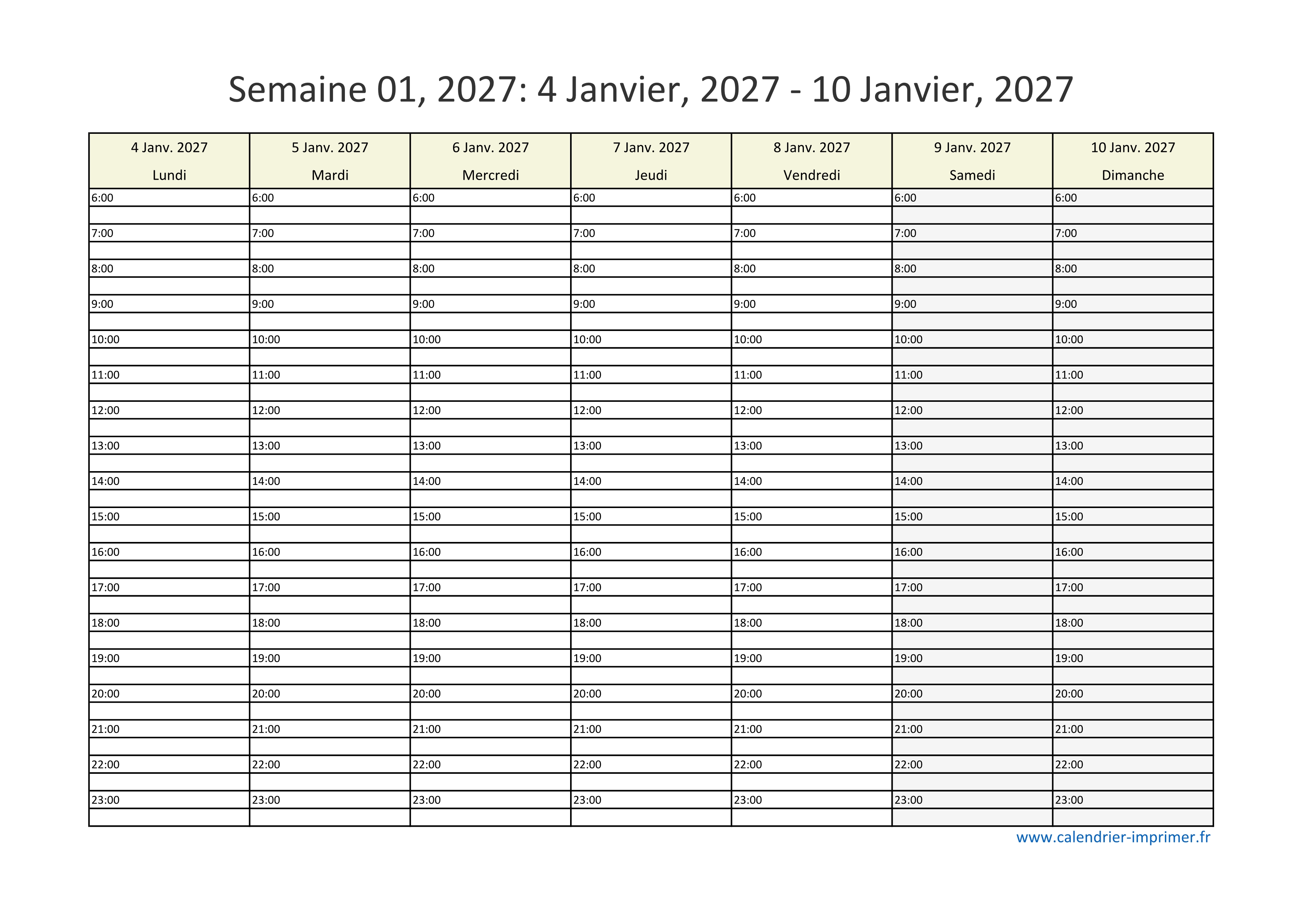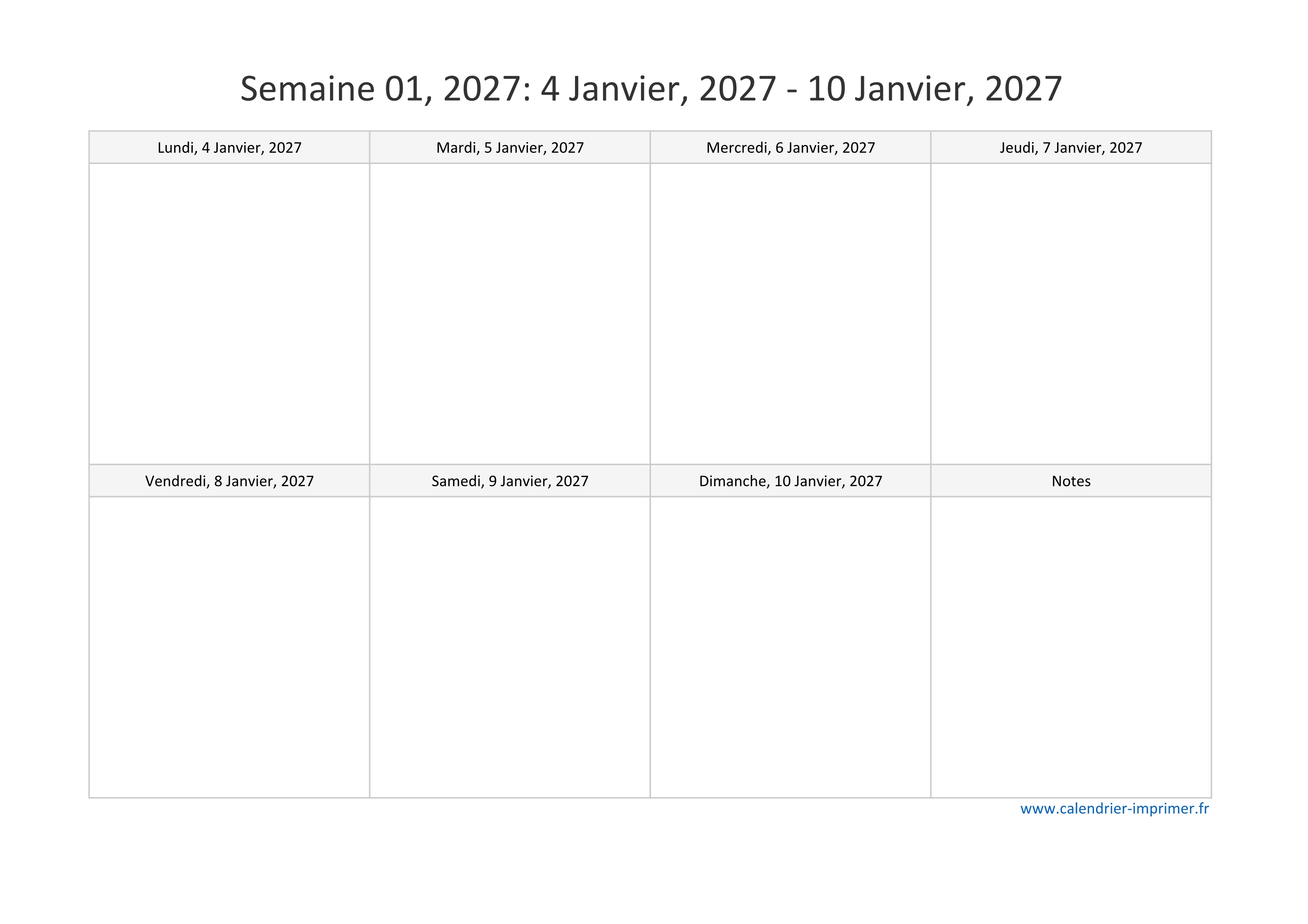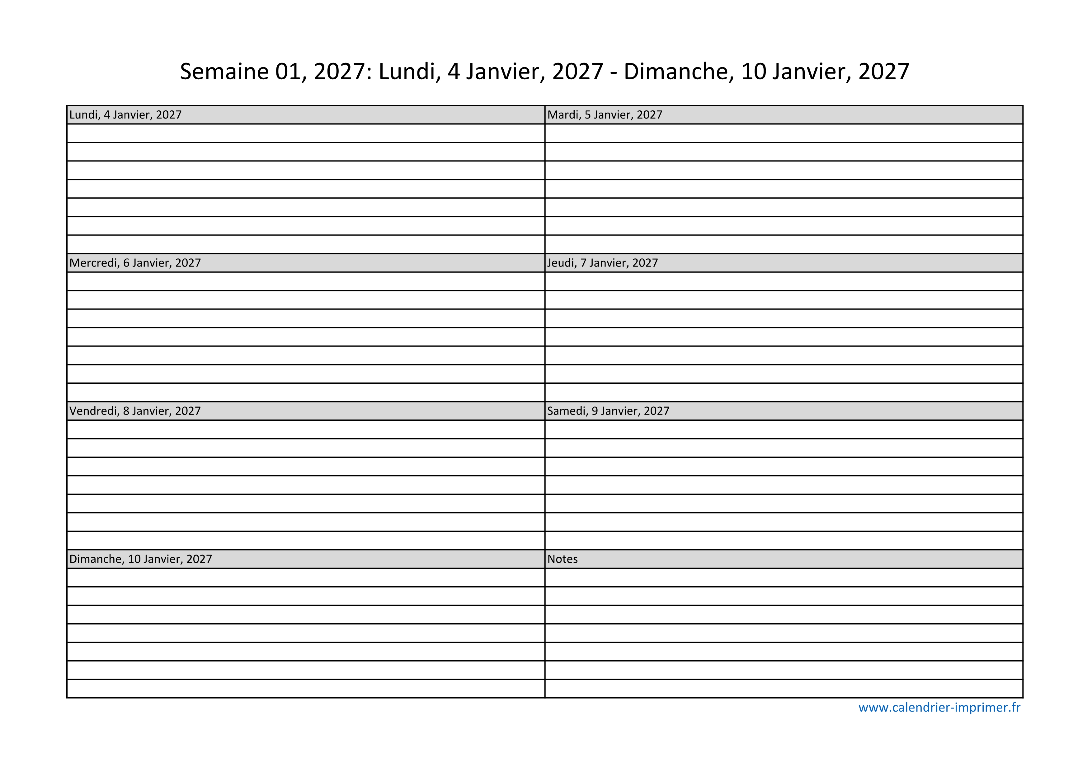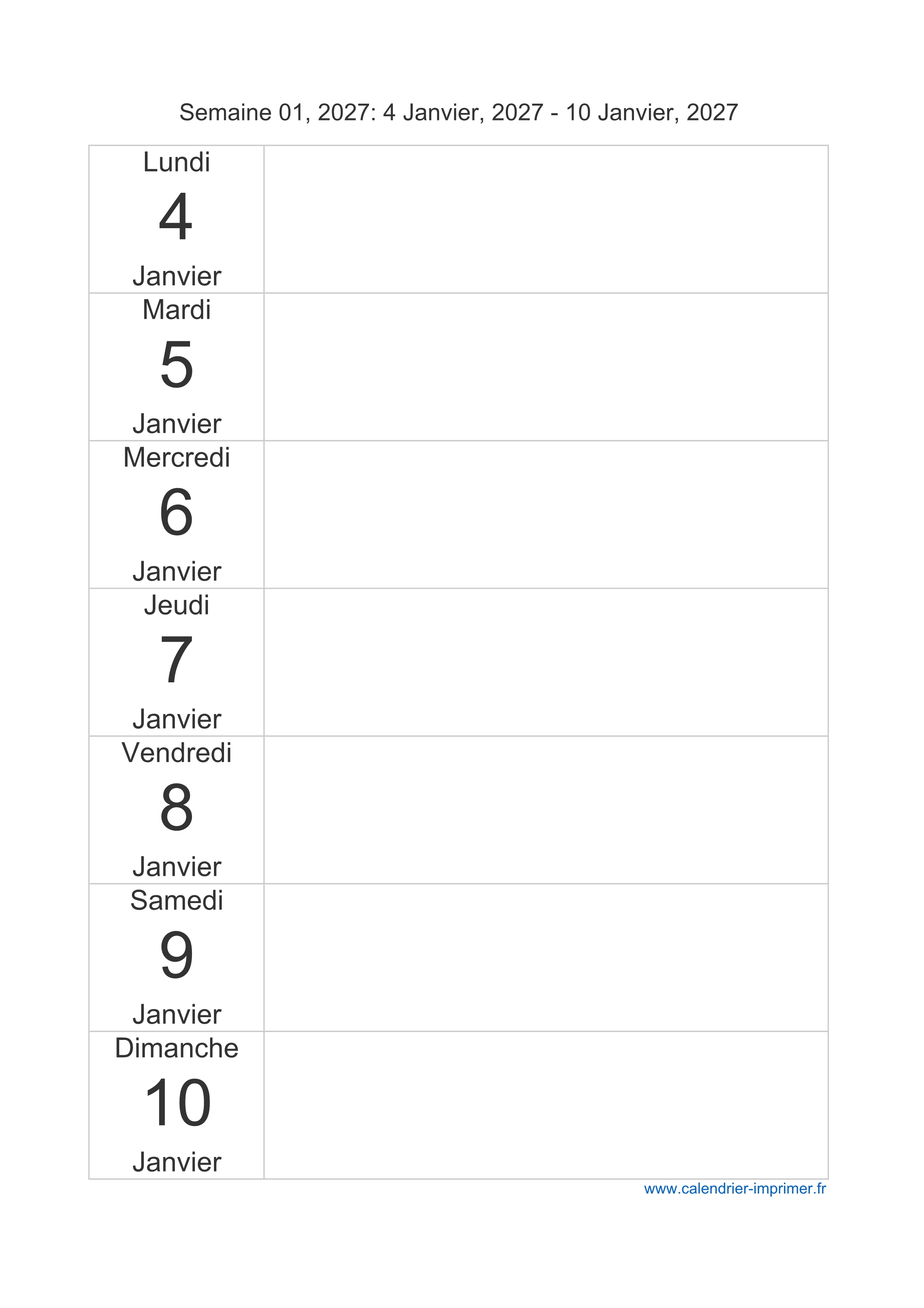 Calendrier 2027 semaine (planning, hebdomadaire, semainier)