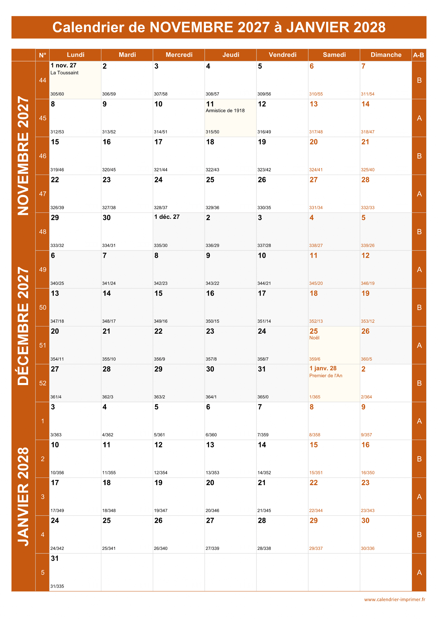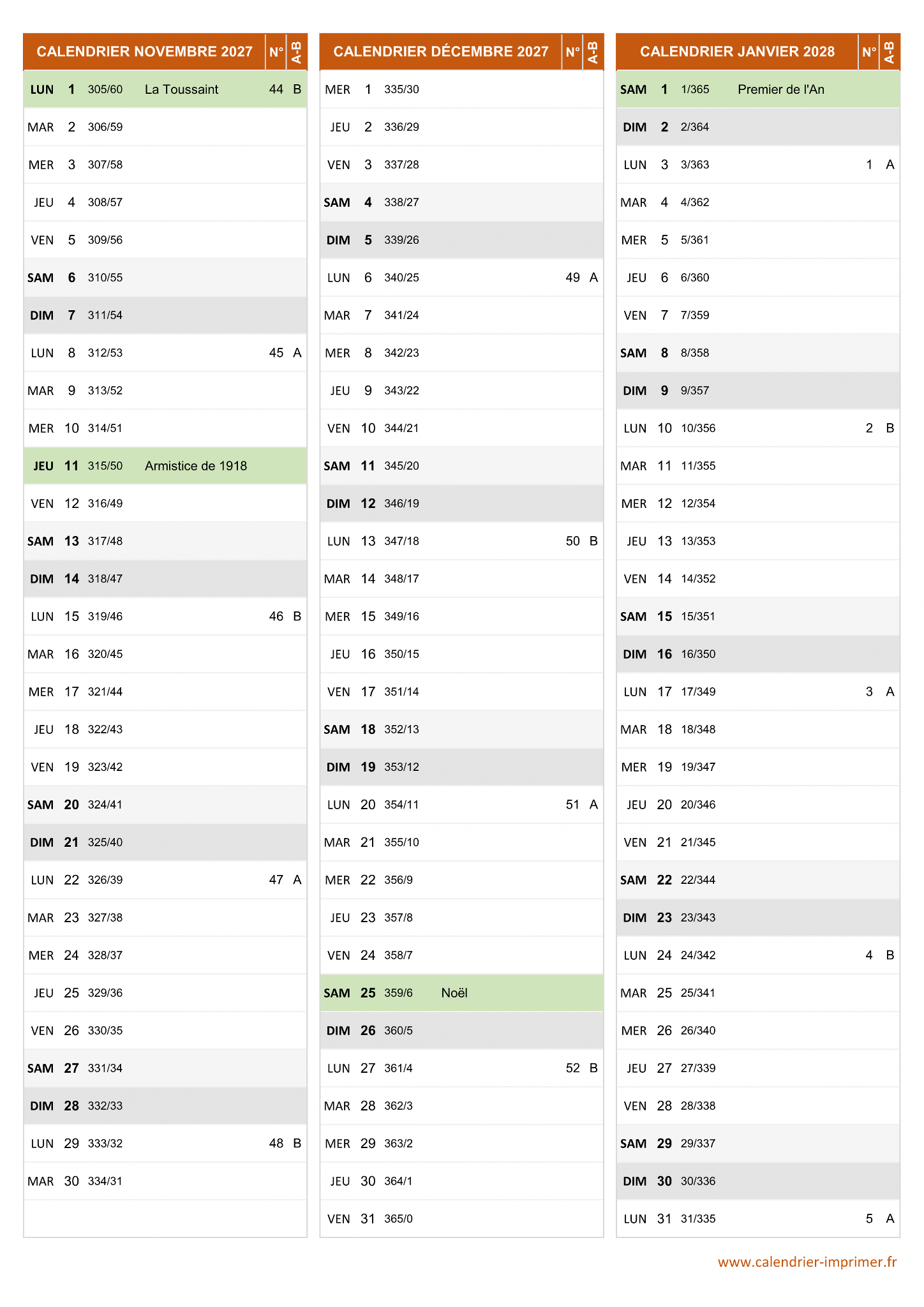 Pour vous aider à planifier et organiser votre emploi du temps sur une période de trois mois, de Novembre 2027 à Janvier 2028, nous mettons à votre disposition un calendrier spécifique pour ces trois mois, à savoir le calendrier de Novembre 2027 à Janvier 2028. Ce calendrier pour les trois mois est conçu pour tenir sur une page au format A4 (en mode portrait ou paysage), ce qui le rend pratique à utiliser. De plus, chaque page de calendrier inclut les numéros de semaine (y compris les semaines paires et impaires), les jours fériés et les périodes de vacances scolaires (le cas échéant). Vous pouvez l'imprimer directement en cliquant sur l'icône d'impression sous chaque modèle de calendrier, ou les télécharger au format Excel, Word, PDF, JPEG en cliquant sur les icônes correspondantes.