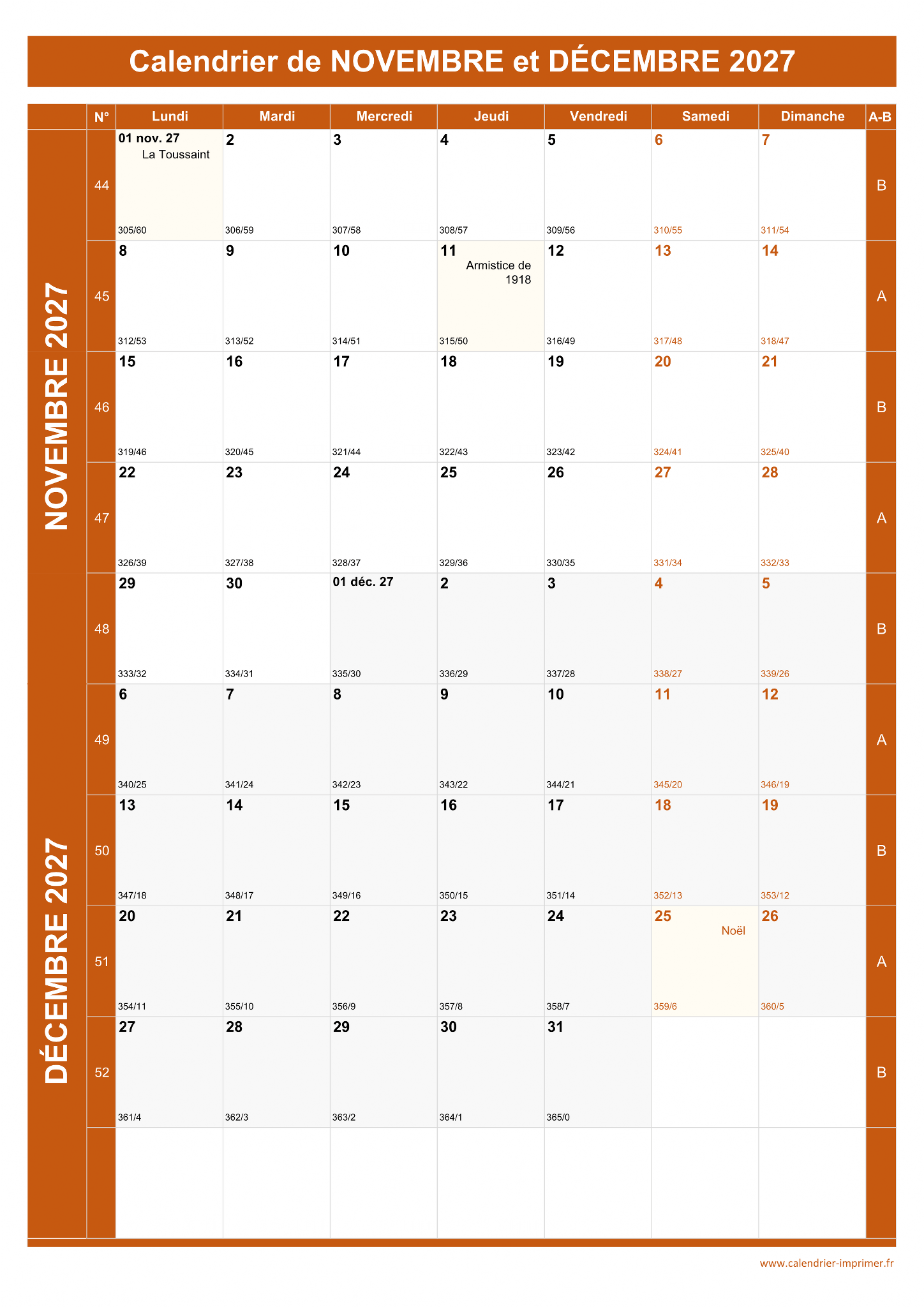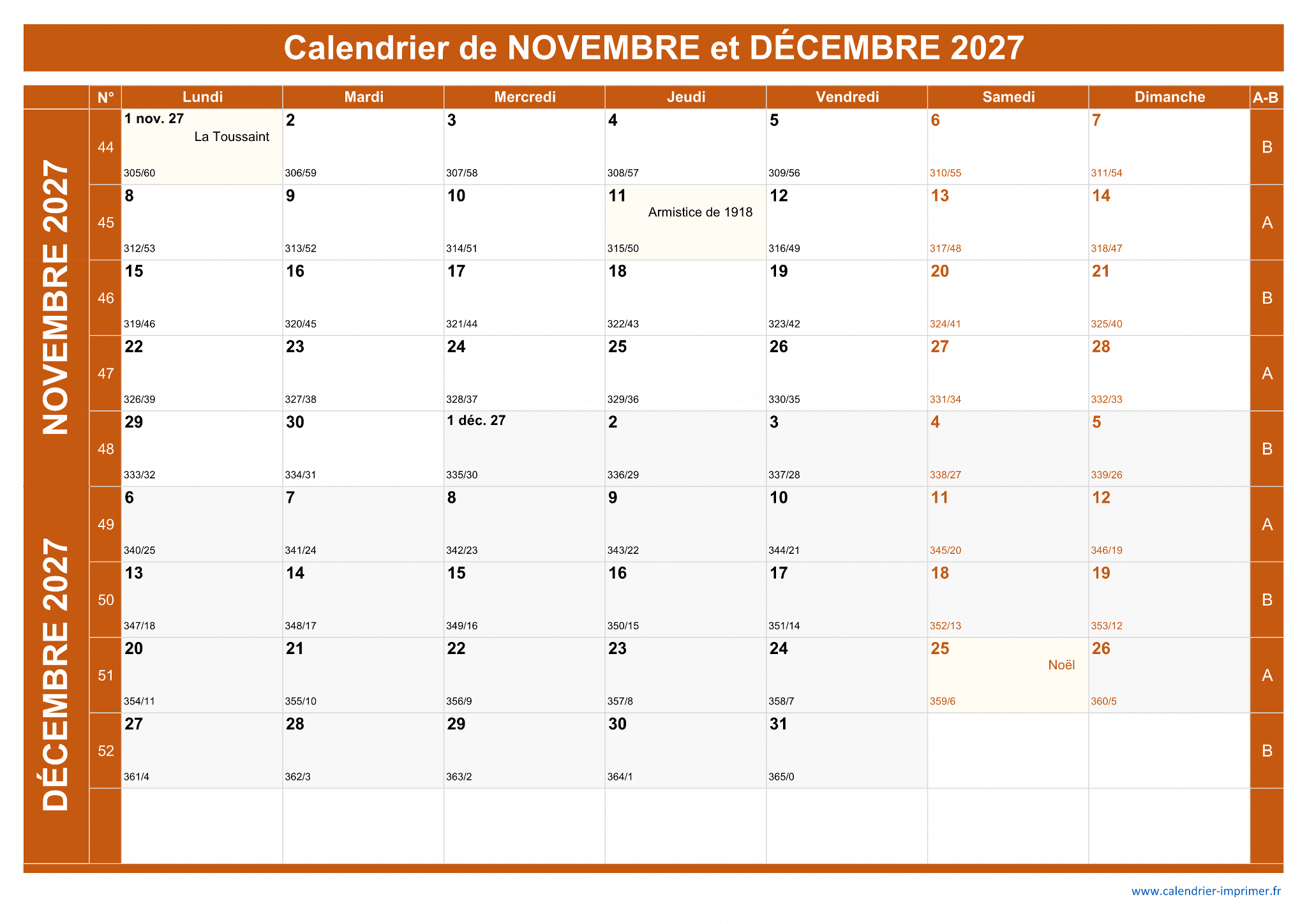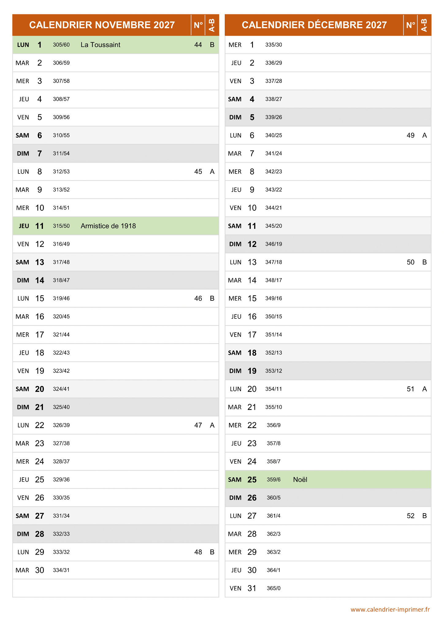 Pour vous aider à préparer et à organiser votre emploi du temps pour les mois de Novembre et Décembre, nous mettons à votre disposition un calendrier spécifique pour ces deux mois, à savoir le calendrier de Novembre 2027 et le calendrier de Décembre 2027. Ce calendrier pour les deux mois est conçu pour tenir sur une page au format A4 (en mode portrait ou paysage), ce qui le rend pratique à utiliser. De plus, chaque page de calendrier inclut les numéros de semaine (y compris les semaines paires et impaires), les jours fériés et les périodes de vacances scolaires (le cas échéant). Vous pouvez l'imprimer directement en cliquant sur l'icône d'impression sous chaque modèle de calendrier, ou les télécharger gratuitement au format Excel (.xlsx), Word (.docx), PDF, JPEG en cliquant sur les icônes correspondantes.