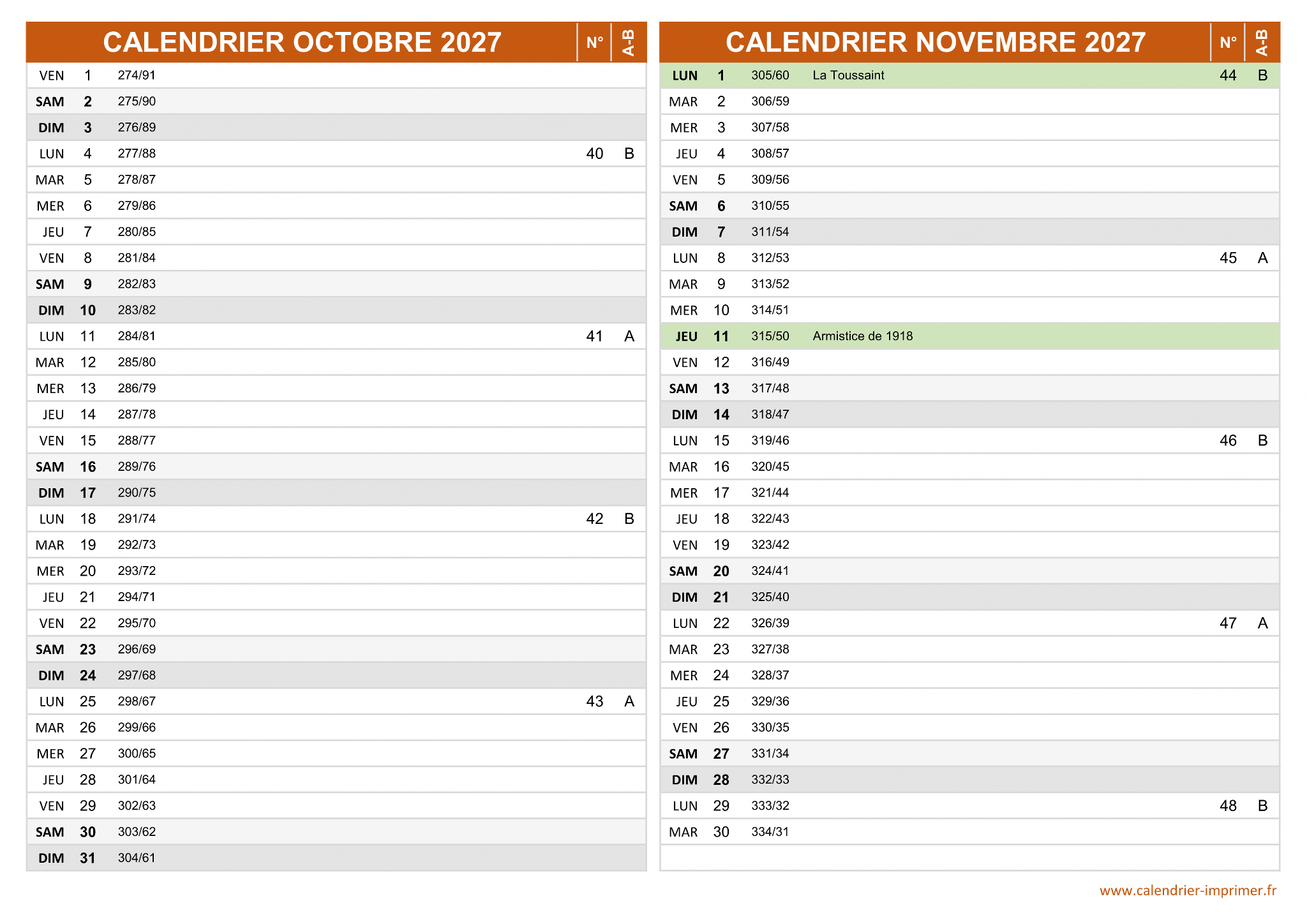 Calendrier Octobre et Novembre 2027 à imprimer