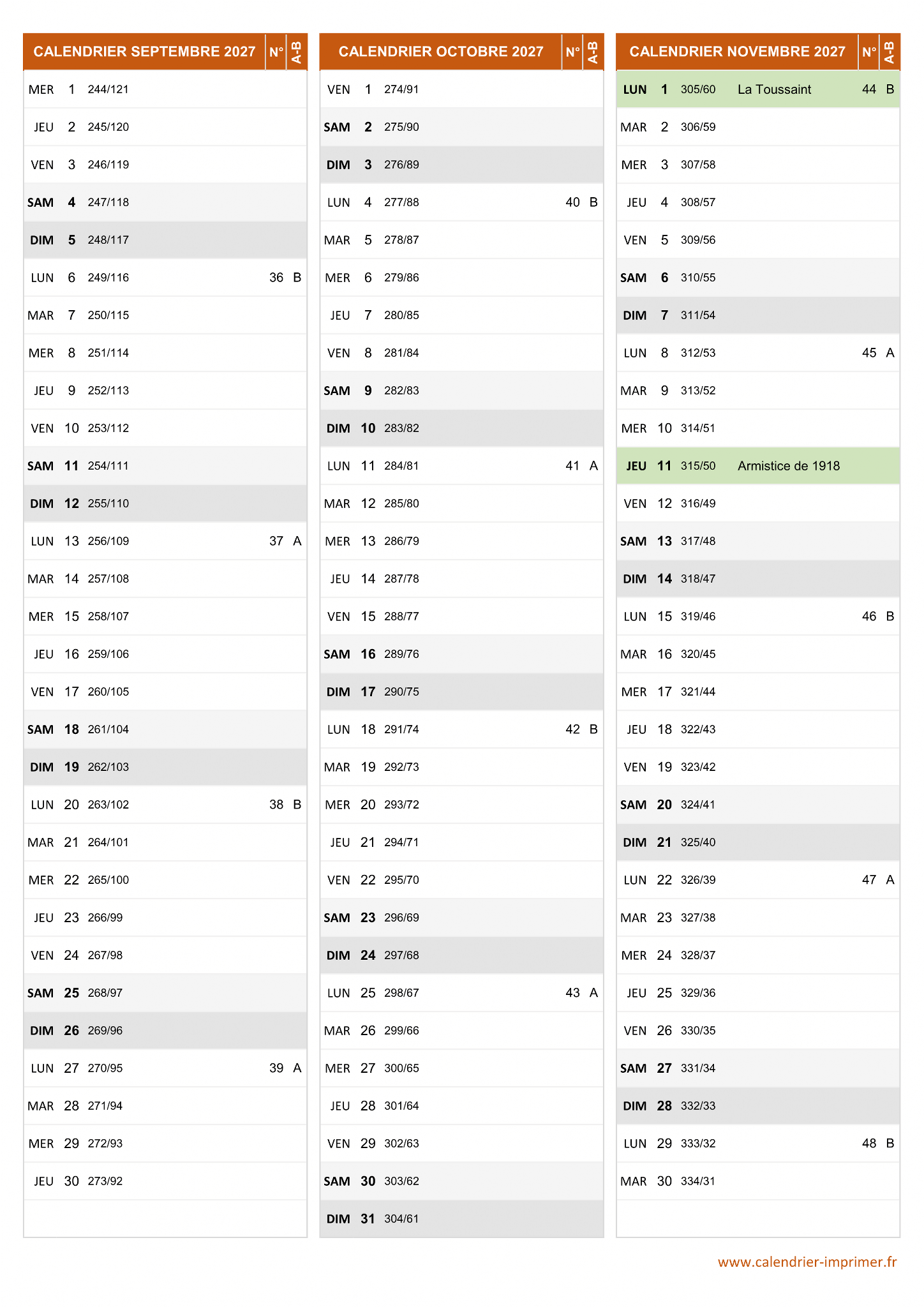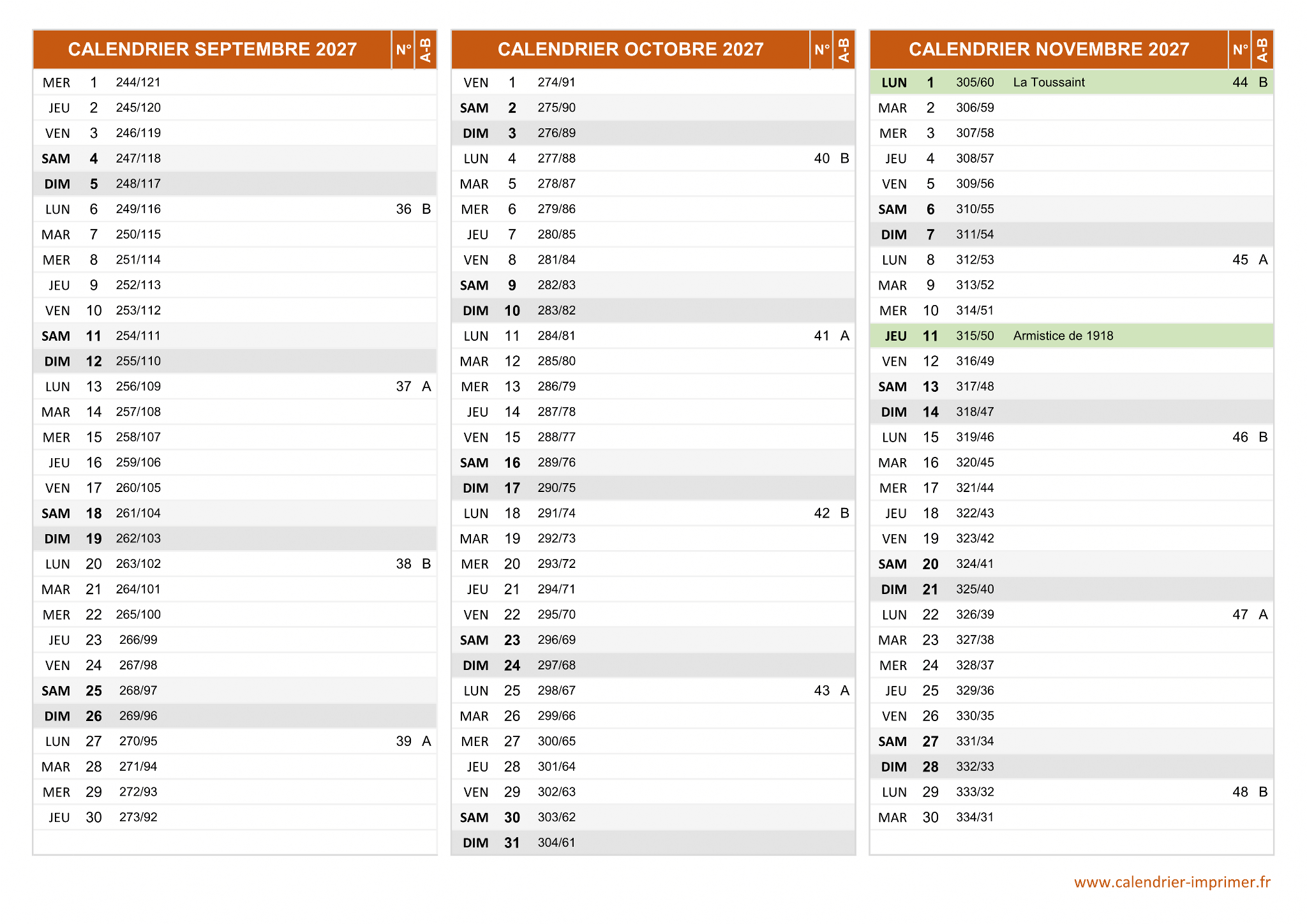Calendrier Septembre à Novembre 2027