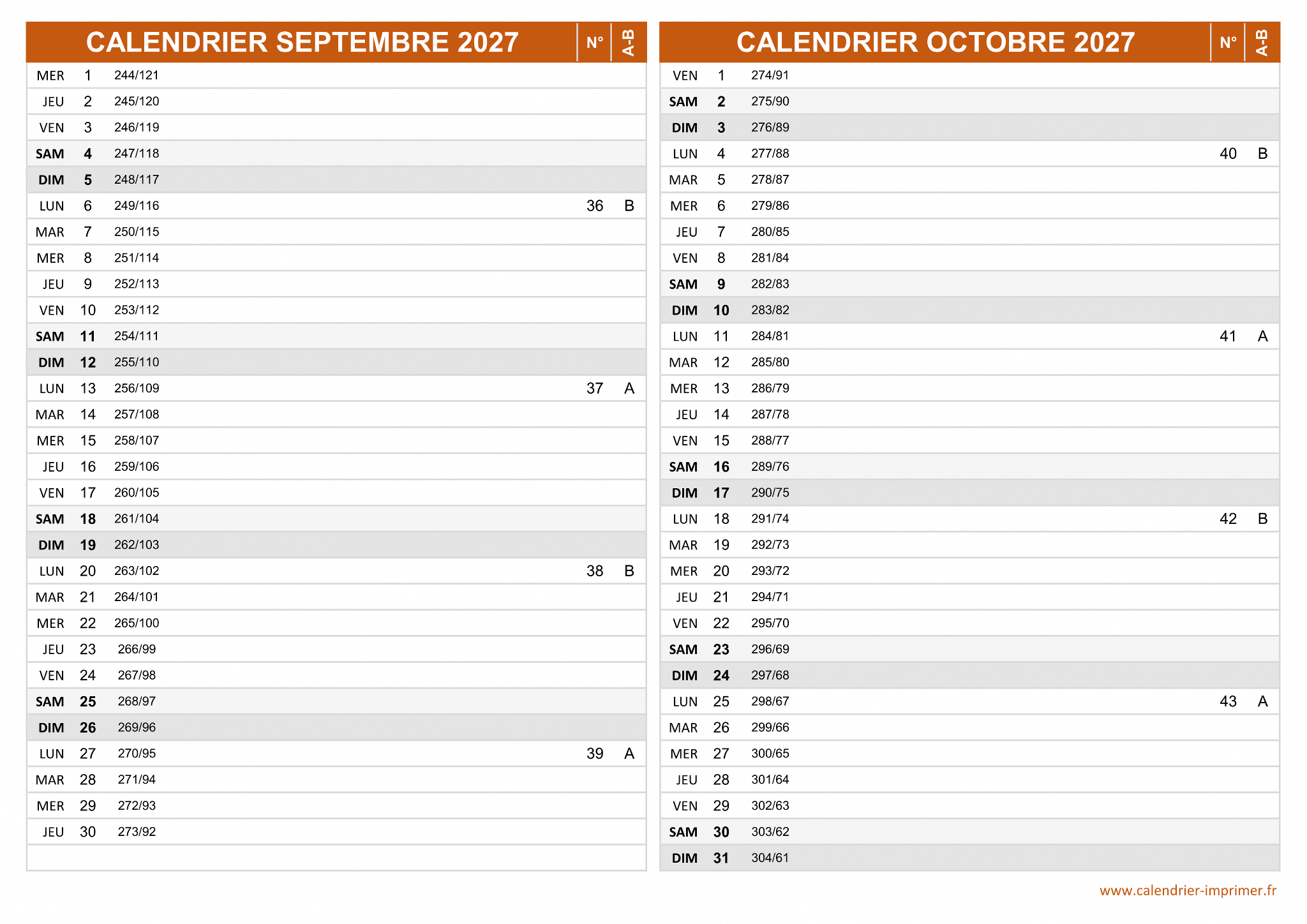 Pour vous aider à préparer et à organiser votre emploi du temps pour les mois de Septembre et Octobre, nous mettons à votre disposition un calendrier spécifique pour ces deux mois, à savoir le calendrier de Septembre 2027 et le calendrier de Octobre 2027. Ce calendrier pour les deux mois est conçu pour tenir sur une page au format A4 (en mode portrait ou paysage), ce qui le rend pratique à utiliser. De plus, chaque page de calendrier inclut les numéros de semaine (y compris les semaines paires et impaires), les jours fériés et les périodes de vacances scolaires (le cas échéant). Vous pouvez l'imprimer directement en cliquant sur l'icône d'impression sous chaque modèle de calendrier, ou les télécharger gratuitement au format Excel (.xlsx), Word (.docx), PDF, JPEG en cliquant sur les icônes correspondantes.